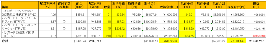 現時点では時価総額7,681,149円、損益+1,641,215円です。