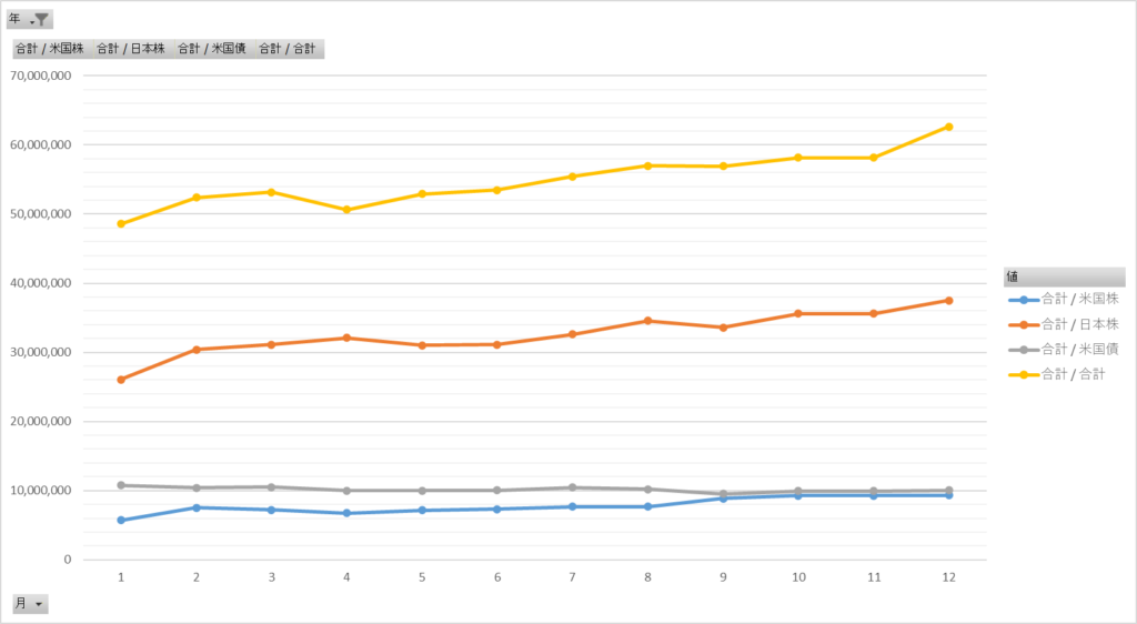 黄色が保有資産の合計、橙色が日本株、青色が米国株、灰色が米国債となっています。