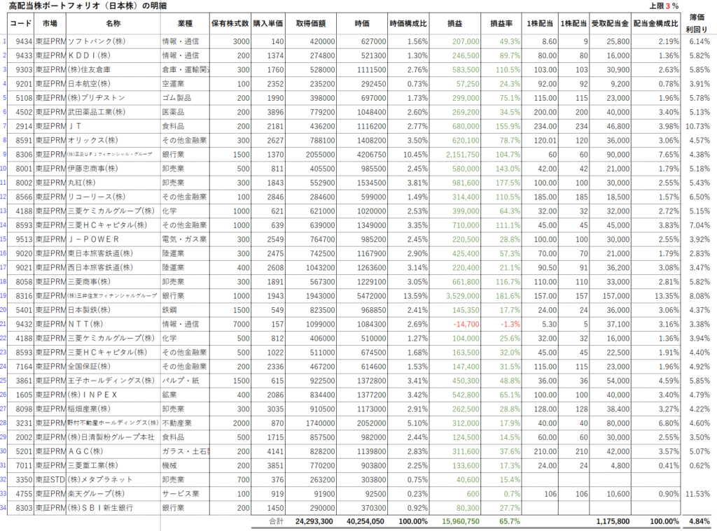 現時点では時価総額40,254,050円、損益15,960,050円です。